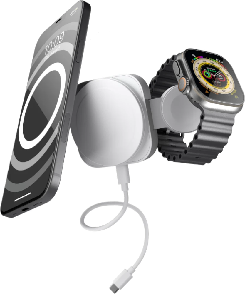 Das 2-in-1-Reiseladegerät MagSafe + Watch ist vollständig kompatibel mit jeder Apple Watch, einschließlich der Apple Watch Ultra. Beim Öffnen des Ständers wird ein iPhone 12 und höher aufgeladen und liegt dem Benutzer in horizontaler Position gegenüber. Ein Reiseetui ist im Lieferumfang enthalten und verstaut das 2-in-1 MagSafe + Watch-Reiseladegerät sowie das USB-C-zu-USB-C-Ladekabel sicher. Dieses einzigartige 2-in-1-Ladegerät inklusive Reiseetui sorgt dafür, dass sich Kabel und Ladegeräte nicht in einer Tasche oder einem Koffer verheddern. Seelenfrieden mit der Kraft in Ihrer Handfläche.